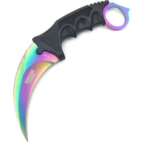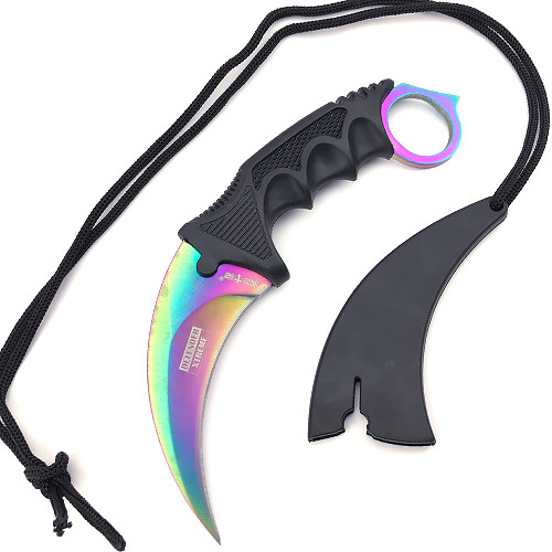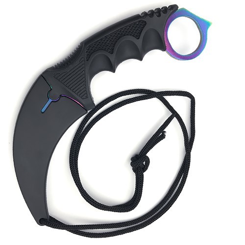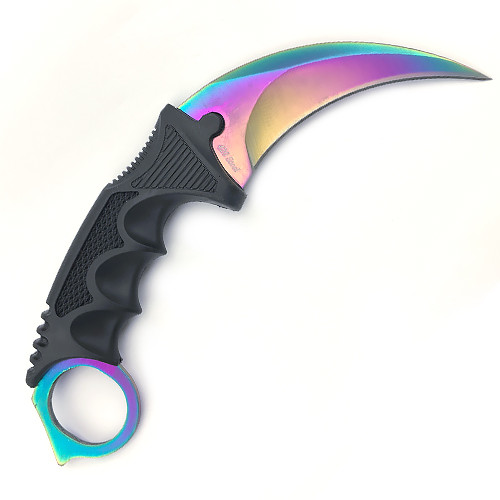 Классический нож керамбит с фиксированным клинком, и цветом градиент, лучший подарок для любителей игры CS GO. Клинок изготовлен из нержавеющей стали марки 420, популярной у производителей. Сталь не восприимчива к влаге, довольно высокая вязкость, легко правится и затачивается. Пластиковая рукоять имеет 3 под пальцевых выемки, и заканчивается кольцом с выступом. Пластиковые ножны есть возможность носить на шее.