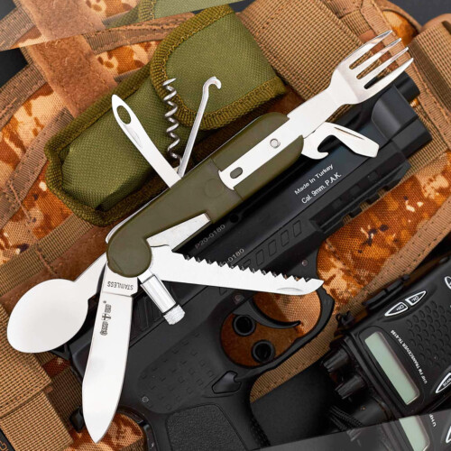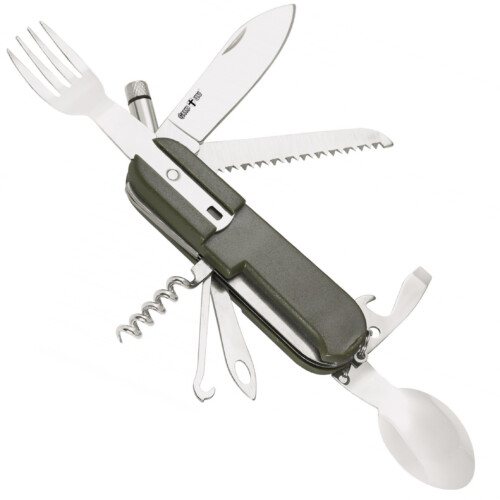 Многофункциональный нож 21130 – это удачное сочетание многопредметного ножа и столового туристического набора. Для тех, кто часто и долго путешествует, находится в пути, подобный туристический атрибут просто необходим. Кроме вилки, ложки и ножика, в него входят открывалка, штопор, шило, пилка по дереву и многофункциональный крючок. А также небольшой светодиодный фонарик, очень актуальный для вечернего приема пищи в походе. Поскольку этот набор занимает мало места, то он оптимален для пикников, рыбалки, при поездке на дачу или в командировку. Прекрасный помощник и при быстром перекусе, и при готовке более сложных блюд, приготовленных в походных условиях.