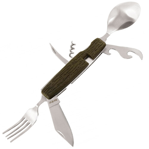 Багатофункціональний ніж 8136 – це вдале поєднання багатопредметного ножа та столового туристичного набору. Для тих, хто часто і довго подорожує, знаходиться в дорозі, подібний туристичний атрибут просто необхідний. Крім вилки, ложки та ножа, до нього входять дві відкривалки, штопор, шило. Прекрасний помічник і при швидкому перекусі, і при приготуванні складніших страв, приготованих у похідних умовах