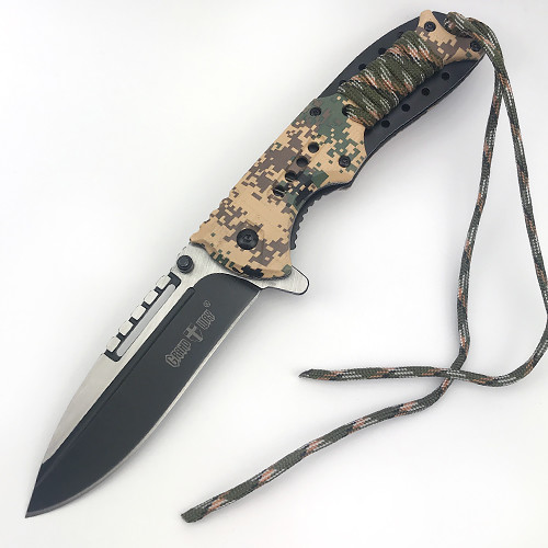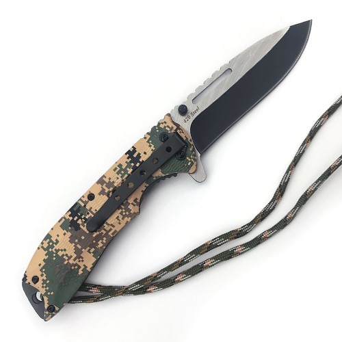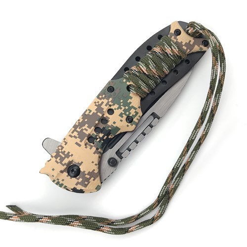 Ніж для повсякденного носіння (EDC). Клинок виготовлений із нержавіючої сталі марки 420, популярної у виробників бюджетного цінового діапазону. Сталь не сприйнятлива до вологи, досить висока в’язкість, легко правиться і заточується. У відкритому положенні клинок фіксується замком Liner Lock. Це сучасний, поширений та надійний замок, який гарантує, що ніж не складеться при великих навантаженнях. Рукоятка виготовлена із пластику, в який вплетений паракорд, що забезпечує надійне утримання навіть у вологій руці. Відкривається ніж за допомогою фліппера та шпенька. Ніж має кліпсу для зручного носіння у кишені.