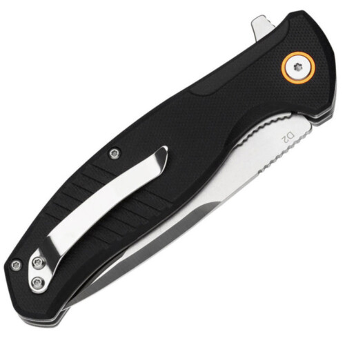 Нож для ежедневного ношения (EDC). Клинок ножа изготовлен из качественной стали D2, разработанной американскими металлургами. Эта сталь обладает высоким содержанием хрома и углерода, благодаря которым имеет прекрасные режущие свойствами, длительное время не нуждается в заточке, и обладает некоторой коррозионной стойкостью. В открытом положении клинок фиксируется замком Liner Lock. Это современный, распространенный и надежный замок, который гарантирует, что нож не сложится при больших нагрузках. Рукоять изготовлена из полимера G-10, который надежен и не боится ни влаги ни перепадов температуры. Открывается нож с помощи шпенька и системы шарикоподшипников. Нож имеет клипсу для удобного ношения в кармане.